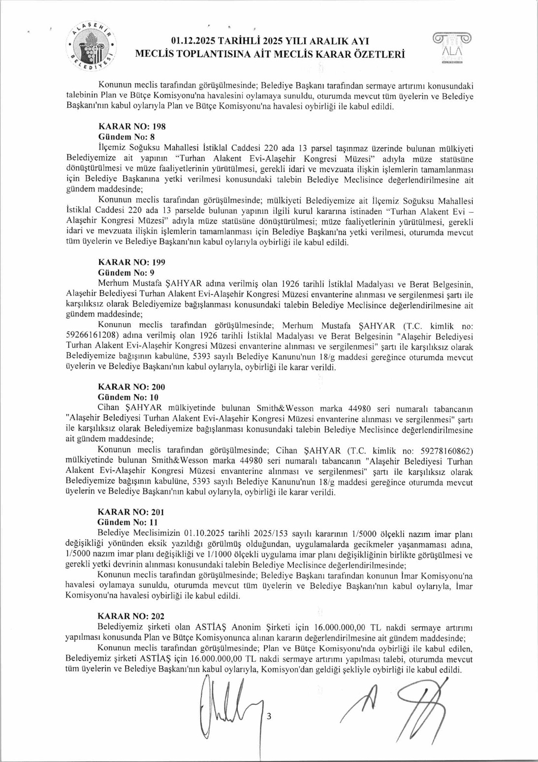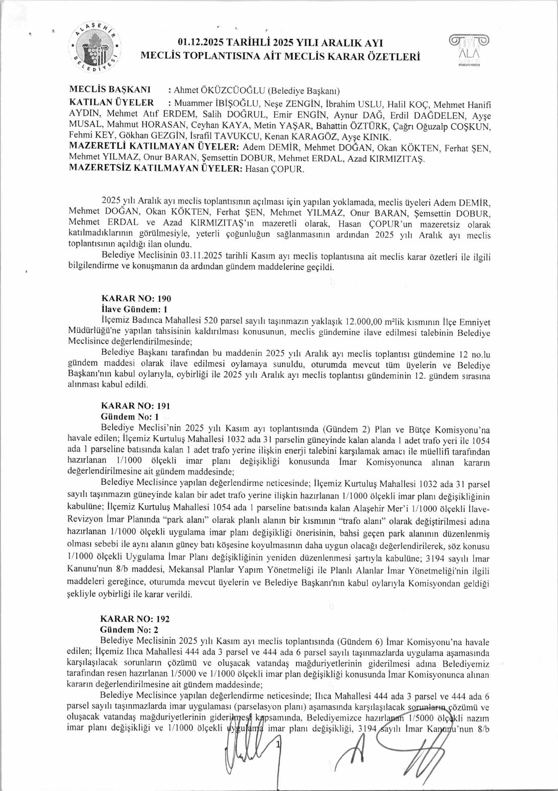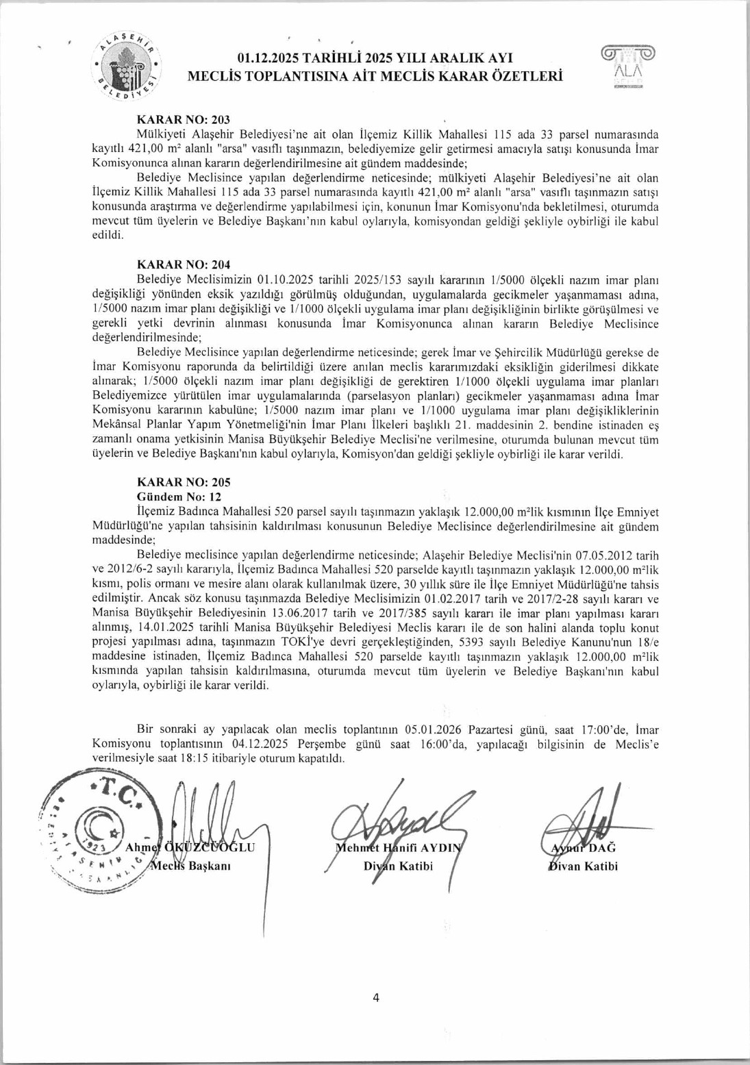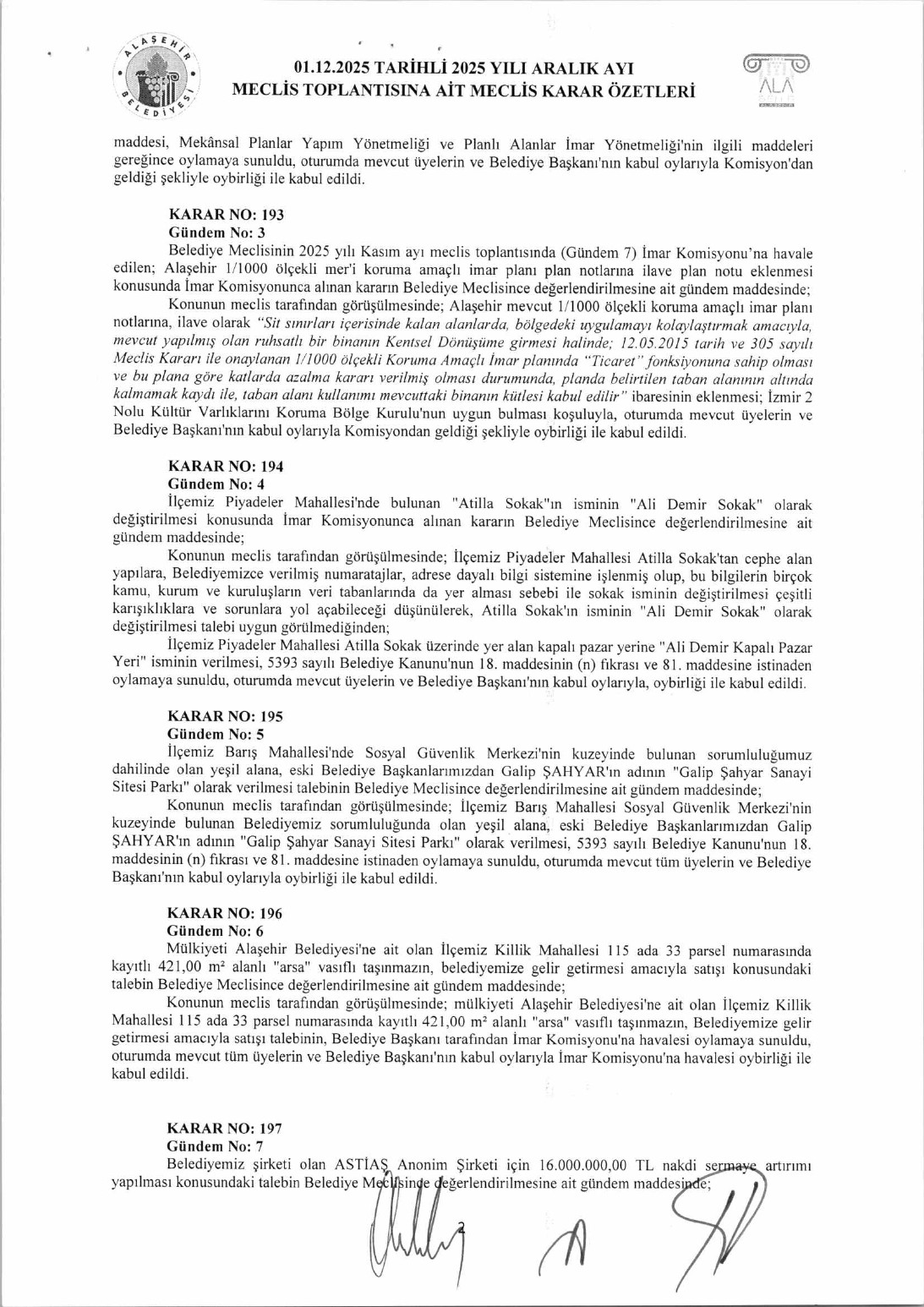 2025 YILI ARALIK AYI MECLİS KARAR ÖZETİ