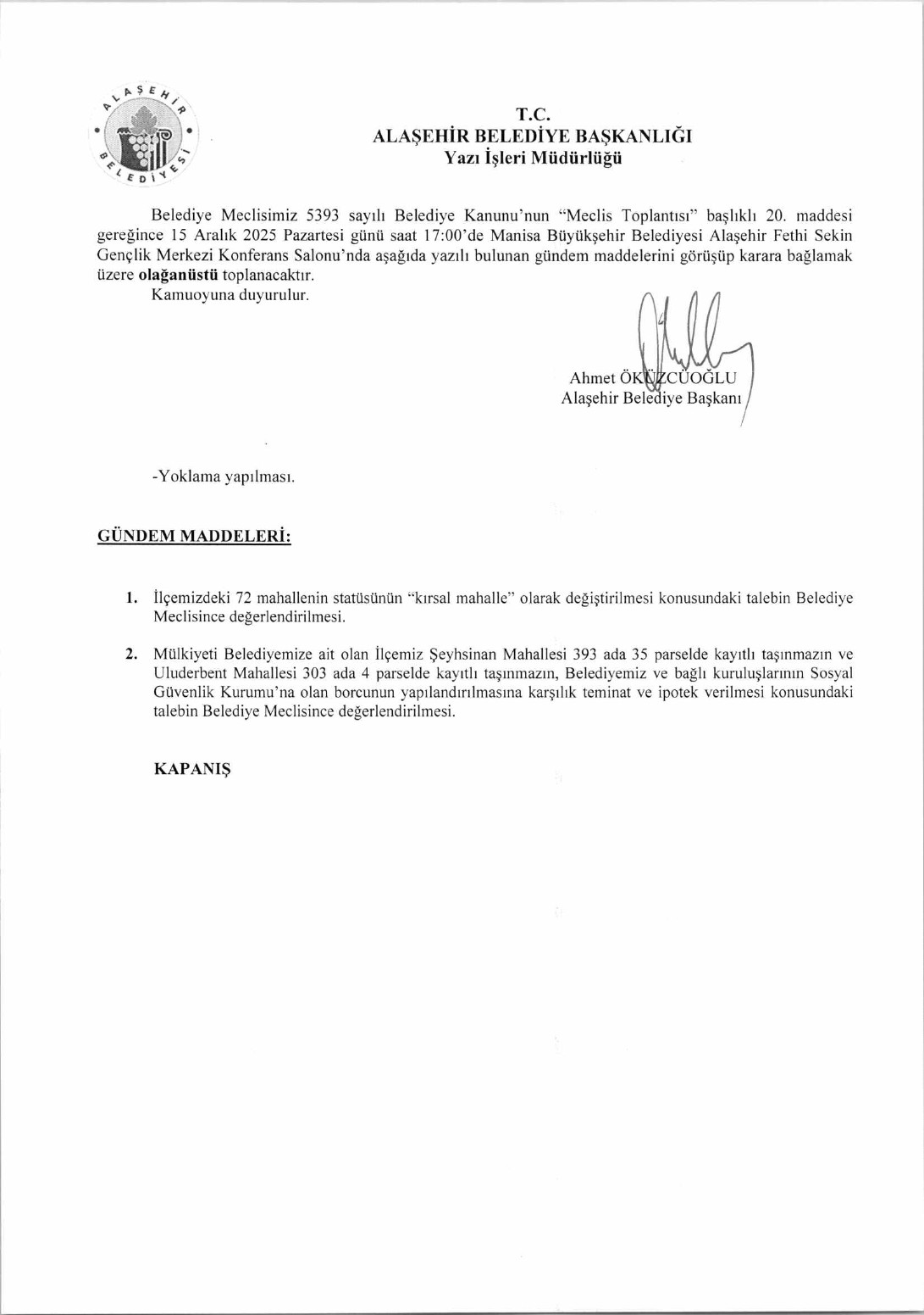 2025 Yılı Aralık Olağanüstü Meclis Toplantısı Gündemi İlanı