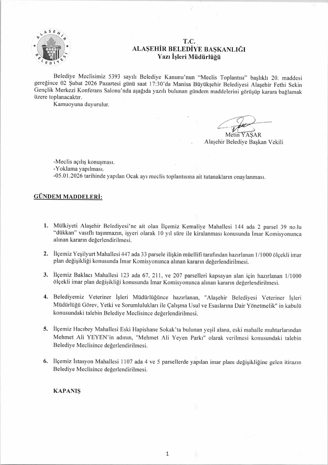 2026 YILI OCAK AYI MECLİS GÜNDEM LİSTESİ