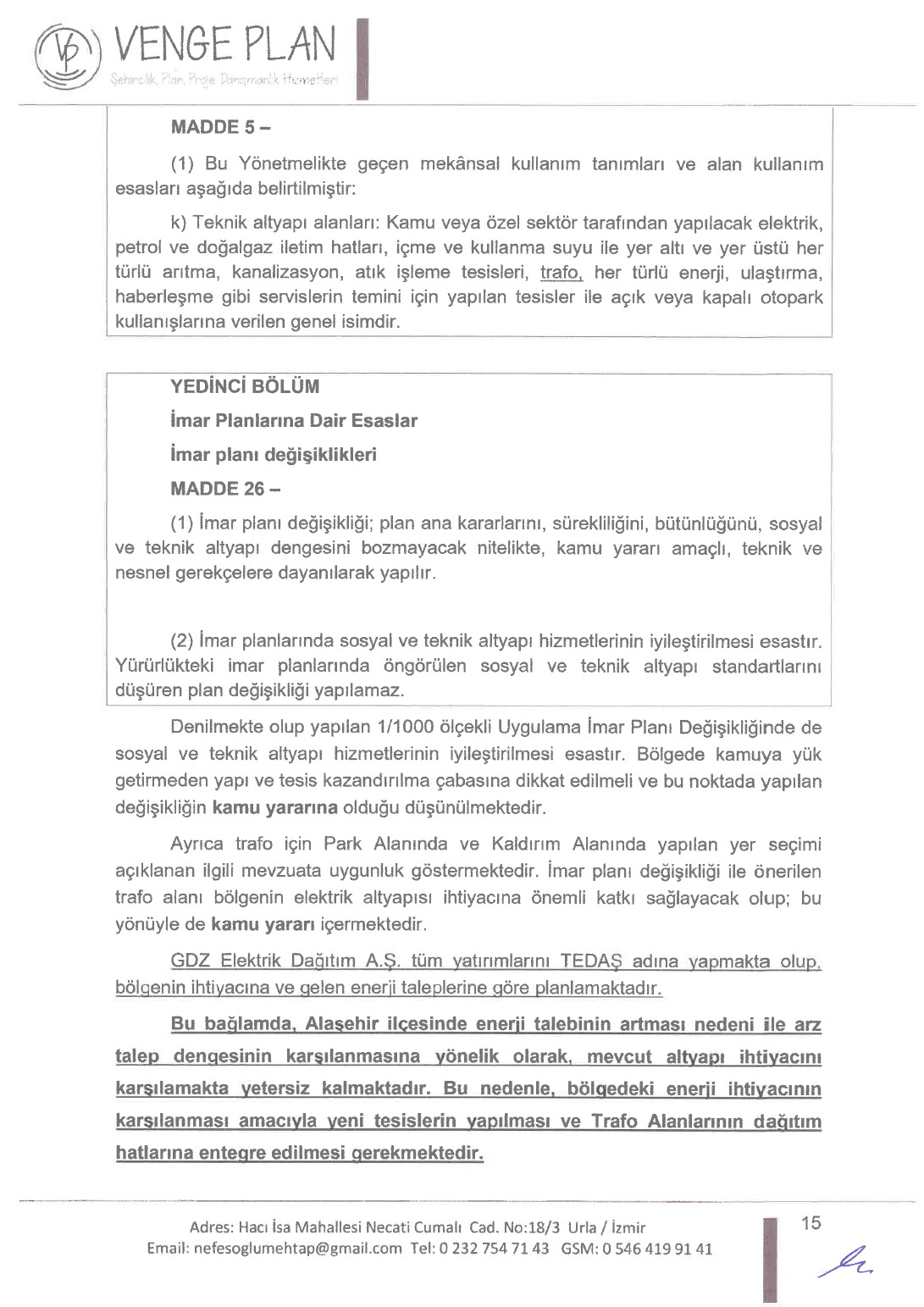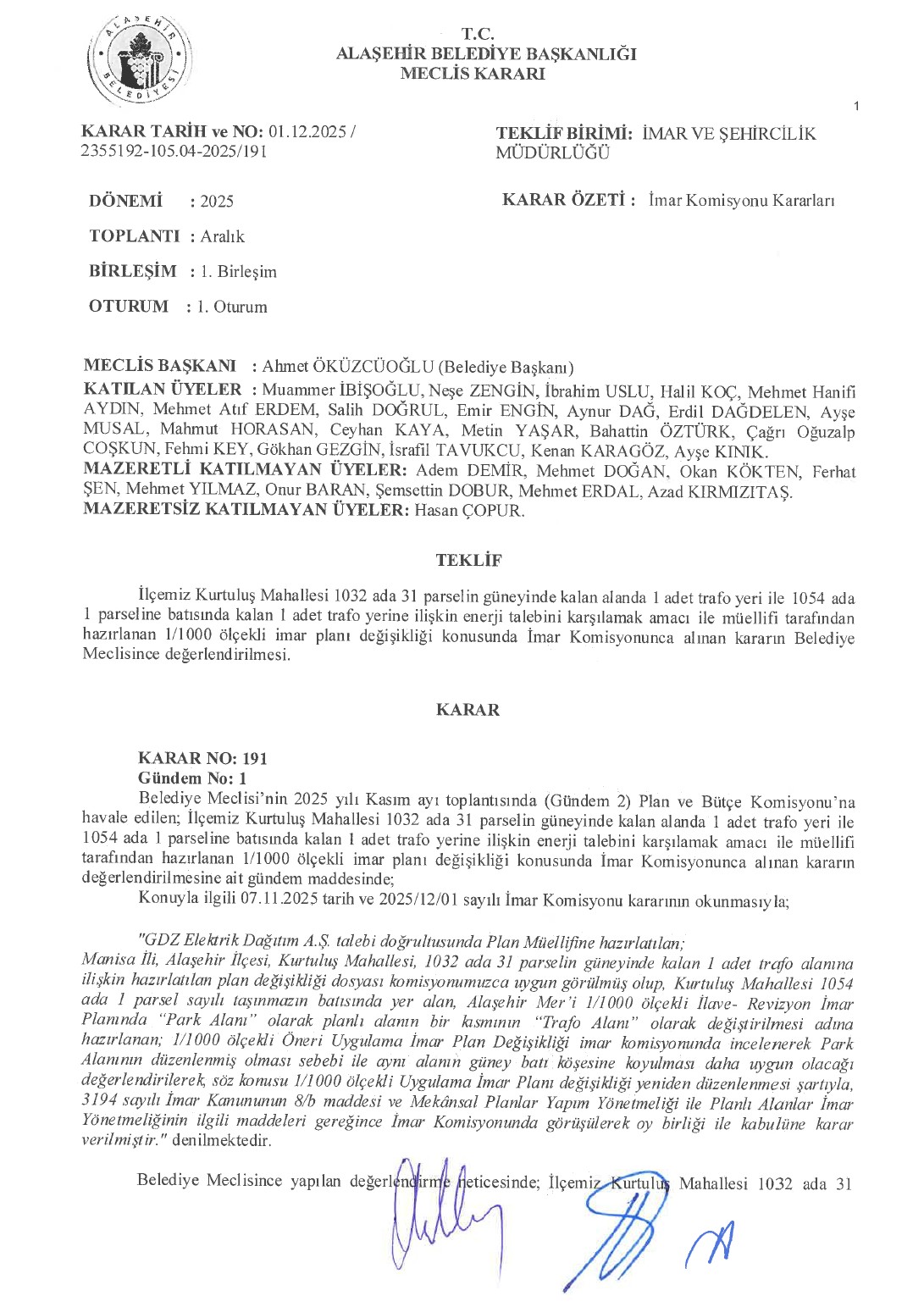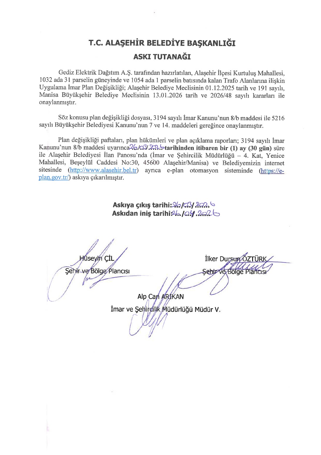 Gediz Elektrik Dağıtım A.Ş. Talebine İstinaden Hazırlanan İmar Planı Değişikliğinin Askı İşlemleri Hk.